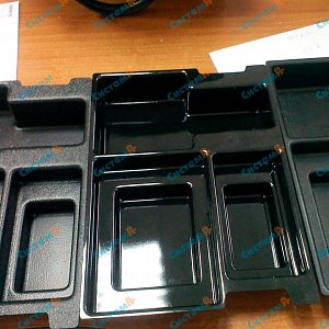 АБС-пластик и ПНД — это ударопрочные, безопасные пластмассы. Они обладают пластичностью, не трескаются и не ломаются под давлением. Пластиковые вкладыши производятся методом вакуумной формовки. Этот способ обработки предполагает изготовление матрицы, поэтому выгоден, если производится крупная или средняя по объему партия товаров. Ложемент из пластика может иметь любую форму и параметры. Срок эксплуатации зависит от качества исполнения изделия и толщины листа пластика. Чтобы заказчик проверил эти параметры, мы производим для него прототип ложемента перед запуском партии.