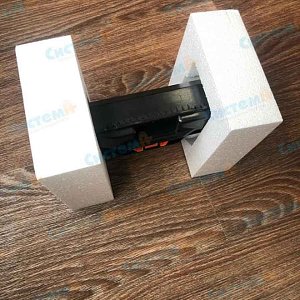Для производства упаковки мы предложили использовать пенополистирол или вспененный полиэтилен. Клиенту понравился первый вариант: пенопласт бюджетный, легкий, прост в обработке, а готовые ложементы защитят картридж со всех сторон - механические повреждения во время перевозки и деформация от климатических воздействий исключены.