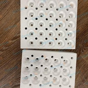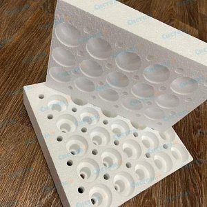 Клиент разработал чертеж ложемента. Он представляет собой цельный каркас со множеством ячеек. Нашей задачей было изготовить вкладыш из хорошо амортизирующего материала. Мы предложили клиенту на выбор пенопласт и сшитый пенополиэтилен. Оба материала хорошо поддаются обработке: реализовать задуманную заказчиком упаковку не составит труда. Однако пенополистирол дешевле, поэтому было решено использовать его.